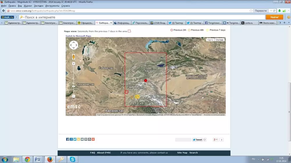 Землетрясение магнитудой 4,2 произошло на территории Кыргызстана 17 января в 06.44 по времени Астаны, передает корреспондент Tengrinews.kz со ссылкой на Европейско-Средиземноморский сейсмологический центр. Очаг подземных толчков зафиксирован на глубине одного километра. Эпицентр землетрясения располагался в 365 километрах к югу от столицы республики города Бишкек и в 113 километрах от Оша. Информации о жертвах и разрушениях нет. 16 января в 18.21 по времени Астаны землетрясение магнитудой 4,1 произошло в Восточном Казахстане. Эпицентр землетрясения располагался в 227 километрах к востоку от Алматы, в 99 километрах к востоку от Караколя (Кыргызстан) и в 55 километрах к юго-востоку от Кегена (Казахстан).
