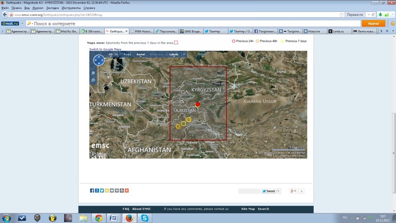 На территории Кыргызстана 3 декабря в 04.30 по времени Астаны произошло землетрясение магнитудой 4,3, передает корреспондент Tengrinews.kz со ссылкой на Европейско-Средиземноморский сейсмологический центр. Очаг подземных толчков зафиксирован на глубине одного километра. Эпицентр землетрясения располагался в 368 километрах к югу от столицы республики города Бишкек и в 130 километрах к юго-востоку от города Ош. Информации о жертвах и разрушениях нет.