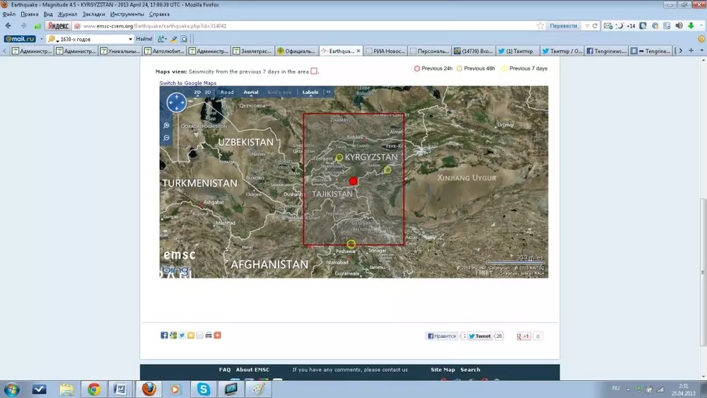 На территории Кыргызстана 24 апреля в 23.08 по времени Астаны произошло землетрясение магнитудой 4,5, передает корреспондент Tengrinews.kz со ссылкой на Европейско-Средиземноморский сейсмологический центр.