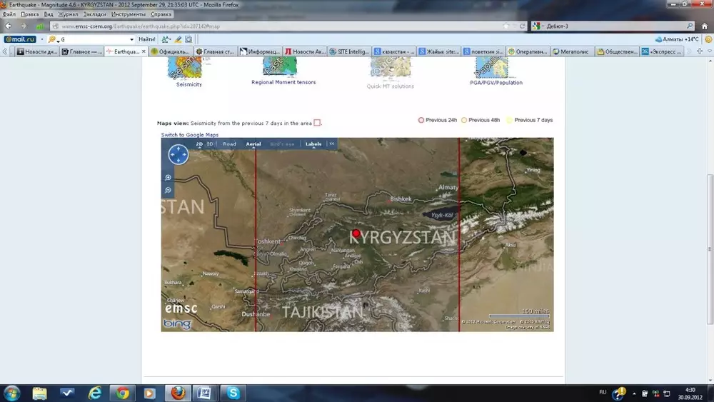 В Кыргызстане в 03.35 по времени Астаны произошло землетрясение магнитудой 4,6, передает корреспондент Tengrinews.kz со ссылкой на Европейско-Средиземноморский сейсмологический центр. Эпицентр подземных толчков зафиксирован на глубине одного километра в 312 километрах к востоку от столицы Узбекистана Ташкента, в 113 километрах к северо-востоку от Андижана (Узбекистан), в 24 километрах к югу от Токтогула (Кыргызстан). Информации о жертвах и разрушениях нет.