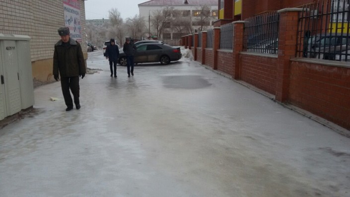 Ледовый нарост, примерно около 5-10 миллиметров, покрыл дороги, электропровода и автомобили. Спешащим на работу актюбинцам приходится мелкими шажками и перебежками добираться до автобусных остановок и такси.