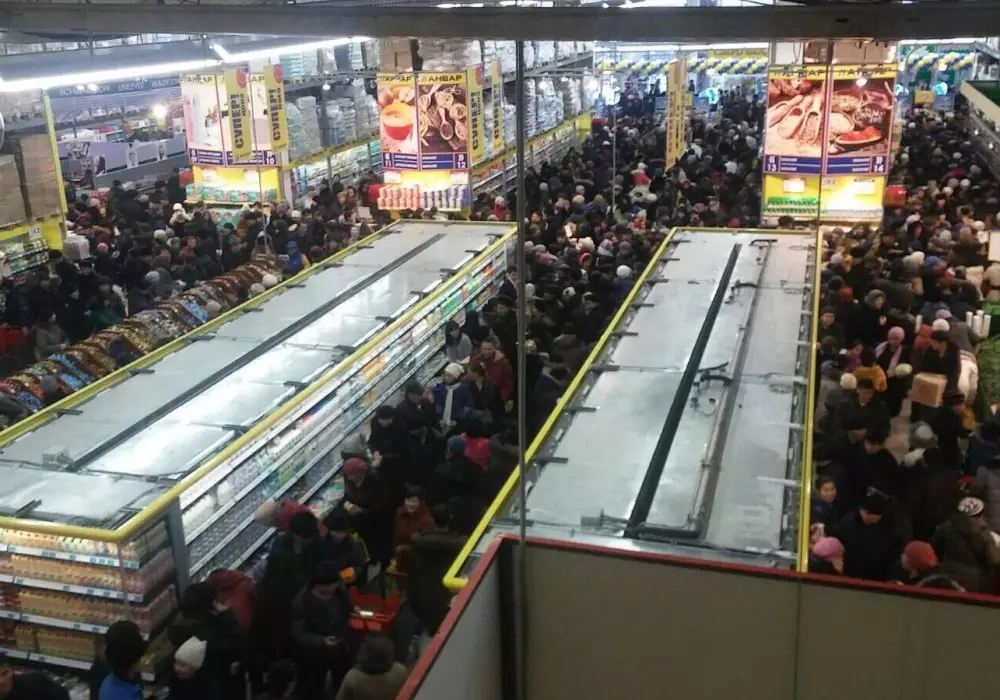 В Актобе местные жители устроили давку на открытии нового гипермаркета "Анвар" по проспекту Нокина. Кадры инцидента, который произошел в среду, 16 декабря, появились на странице zello_aktobe в Instagram.
