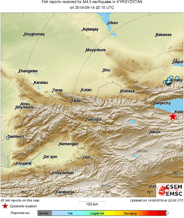 По данным Европейского-Средиземноморского сейсмологического центра, эпицентр землетрясения магнитудой 4,6 находился в 137 километрах на юг от Алматы на территории Кыргызстана.