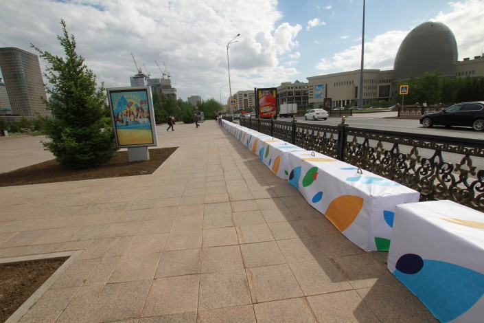 Также на площади перед городским акиматом и на бульваре "Нурлы жол" появились бетонные ограждения. Как пишут пользователи социальных сетей, это антитаранные защитные средства.