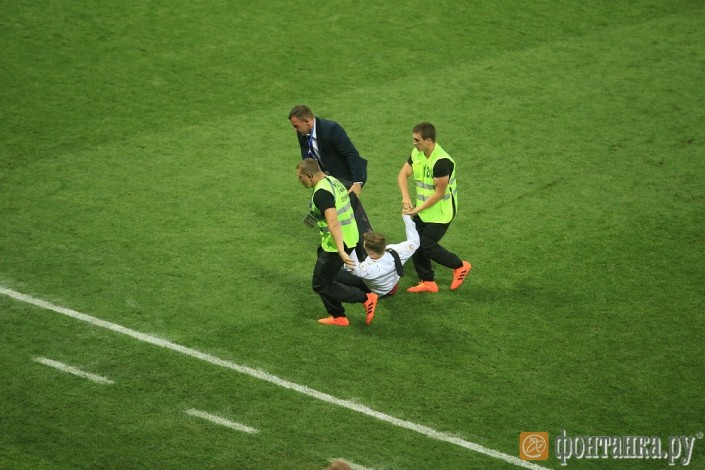 По данным портала "Фонтанка.ру", это были участники панк-группы Pussy Riot, на поле выбежали они. Акцию они назвали "Милиционер вступает в игру". "Им удалось перебраться через ограждения, прорваться сквозь стюардов и выбежать на поле. Возможно, им помогло то, что они были одеты в униформу. Поймать их удалось лишь в центре поля. Уносили их буквально на руках", - отмечает издание.