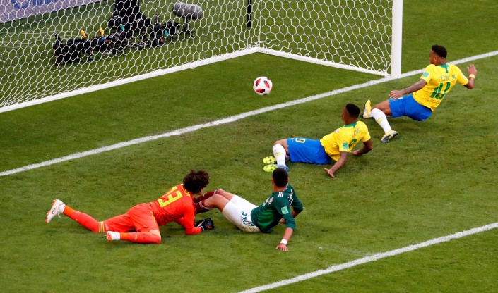 Первый гол пятикратные чемпионы мира забили на 51-й минуте матча. Виллиану прошел в штрафную ацтеков, прострелил вдоль ворот, где Неймар, воспользовавшись ошибкой Жезуса, занес мяч в пустой от голкипера угол ворот. Неймар забил свой шестой гол на чемпионатах мира и сравнялся по этому показателю с легендарными соотечественниками Бебето и Роберто Ривеллино.