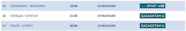 В 18.00 по времени Астаны в Саранске сыграют команды Колумбии и Японии. Трансляция матча запланирована на телеканале Qazsport. Онлайн-трансляция.