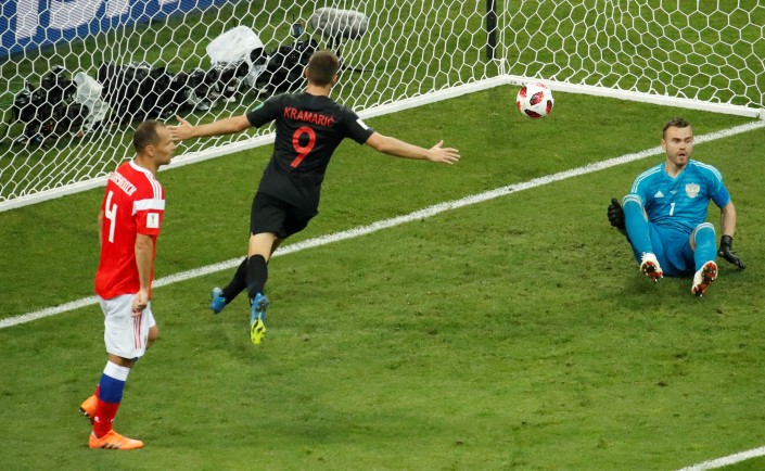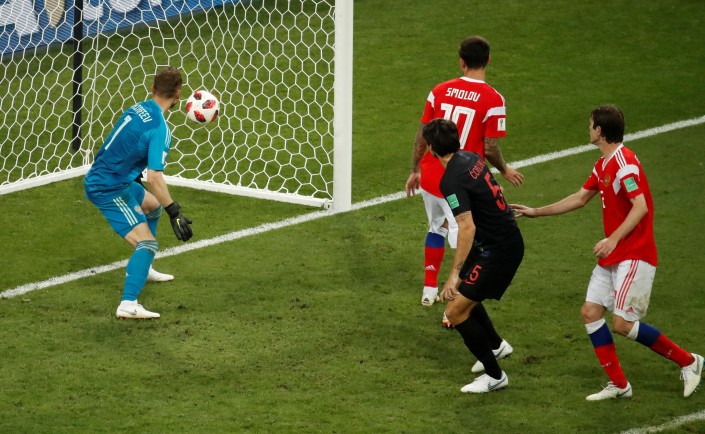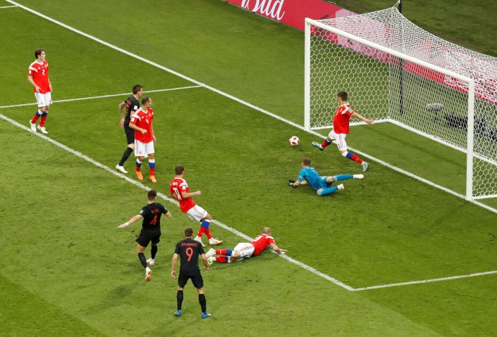 На 101-й минуте Домагой Вида забивает казалось решающий мяч в этой встрече. После подачи углового защитник хорватов оказывается выше обороны россиян и пробивает головой в угол ворот Акинфеева. После пропущенного гола Черчесов выпускает на поле Алана Дзагоева, а игра россиян приобретает агрессивный и максимально напористый характер.