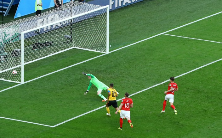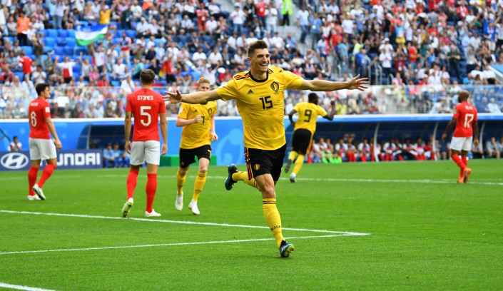 Первый гол в этом матче забил Тома Менье. Уже на четвертой минуте встречи защитник бельгийской команды замкнул передачу с фланга и вывел свою команду вперед. Англичане не ждали столь стремительного гола, и до конца второго тайма испытывали удачу в нападении, но к результативным последствиям это так и не привело. Первый тайм завершился со счетом 1:0 в пользу Бельгии, но с заметным преимуществом Англии во владении мячом - 56 процентов против бельгийских 44. В то же время Бельгия нанесла на один удар в створ больше своих оппонентов 7:6