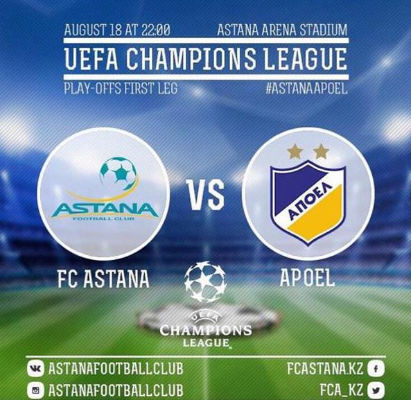 18 августа на столичном стадионе "Астана-Арена" состоится первый матч раунда плей-офф Лиги чемпионов между "Астаной" и кипрским АПОЭЛом. Игра начнется в 22.00 по местному времени. В прямом эфире ее покажет телеканал "Тан". Ответная игра между командами состоится в ночь с 26 на 27 августа в Никосии.