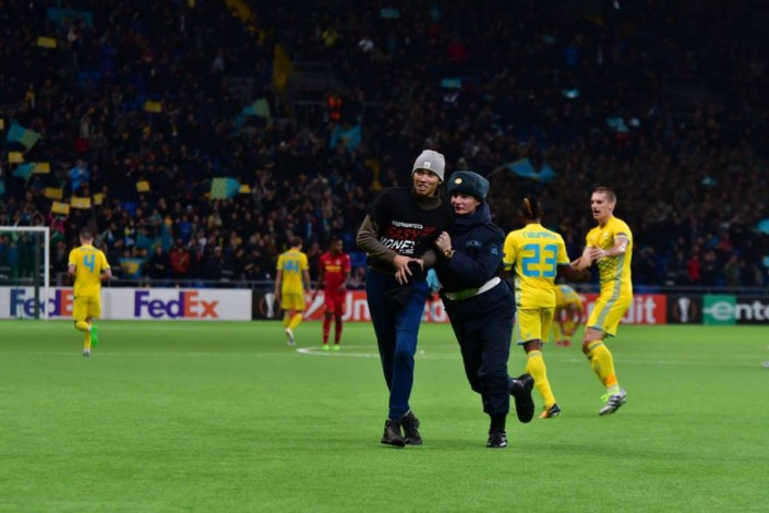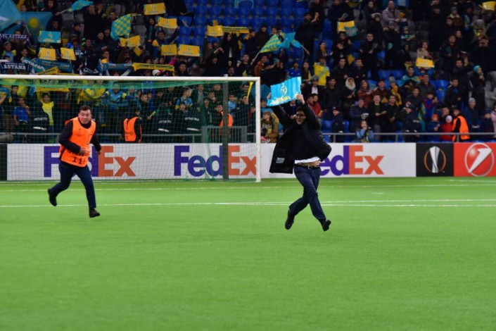 Четыре болельщика выбежали на поле в матче Лиги Европы между "Астаной" и испанским "Вильярреалом", передают Vesti.kz.