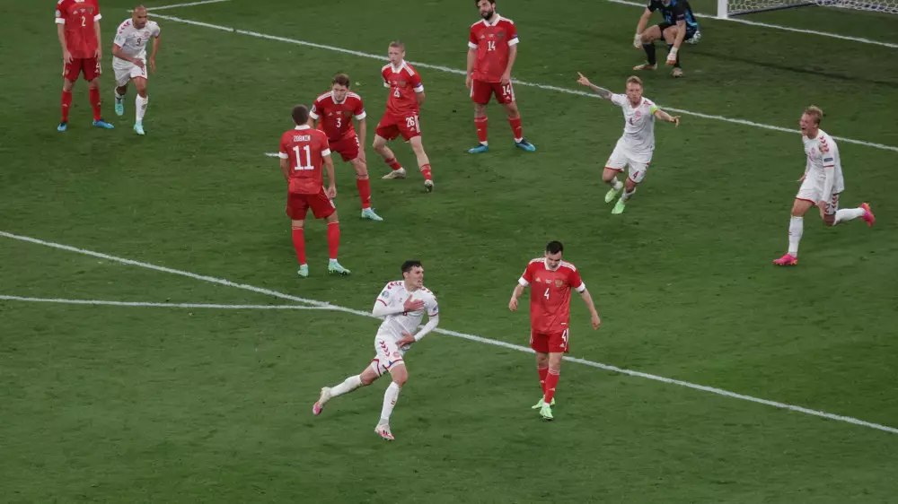 При этом датские футболисты неплохо прицеливались из-за пределов штрафной площади. На 29-й минуте дальний удар нанес Пьер Хейбьерг, казалось, что мяч оказался в сетке ворот, но прошел рядом со штангой.
