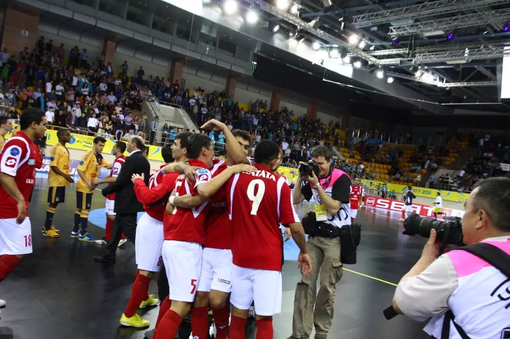 Алматинский "Кайрат" стал обладателем бронзовых медалей Кубка УЕФА по футзалу. Казахстанцы одержали победу над португальской "Бенфикой" в серии послематчевых пенальти со счетом 4:3. Поединок состоялся во Дворце спорта имени Балуана Шолака в Алматы в рамках "Финала четырех", передает корреспондент Tengrinews.kz. Счет в матче на 6-й минуте открыл кайратовец Лео Сантана. Далее "Бенфика" ринулась в атаку, Сезар Пауло пробил по воротам, но голкипер алматинцев Жеронимо справился с его ударом. На 11-й минуте нападающий "Кайрата" Рикардо да Силва забил второй гол в ворота соперника, однако через несколько минут нападающий "Бенфики" Жоэл Кейрос сумел сократить отставание. Так, первый тайм завершился со счетом 2:1 в пользу казахстанцев. Второй тайм получился очень драматичным. На 23-й минуте защитник "Бенфики" Гонсалу поразил ворота Жеронимо, сравняв счет. "Кайрат" сразу же пустился в ответную атаку. Катата пробил по воротам, но голкиперу португальцев Бебе удалось отразить удар. На 27-й минуте судья за неспортивное поведение показал красную карточку нападающему "Бенфики" Дави, а еще через пару минут с поля был удален капитан "Кайрата" Келсон. Буквально через минуту после этого главный тренер алматинского клуба Жоао Карлос Барбоза также был удален с поля за споры с судьей. На 31-й минуте отличился Сезар Пауло, сделав счет 3:2 в пользу португальцев, но на 36-й минуте кайратовцу Филипе удалось сравнять счет. В итоге основное время матча завершилось ничьей. В серии пенальти "Кайрату" удалось забить пять из пяти мячей.