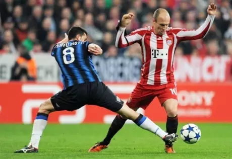Первая встреча команд закончилась со счетом 0:1 в пользу "Баварии", однако итальянская команда вышла в 1/4 финала благодаря голам на чужом поле. На 4-й минуте гол в ворота немцев забил камерунский форвард "Интера" Самуэль Это'О. Ответный мяч в ворота "Интера" отправил Марио Гомес, счет удвоил Томас Мюллер. Во втором тайме Уэсли Снейдер (64-я минута) и Горан Пандев (88-я минута) забили по голу, обеспечив команде выход в четвертьфинал.