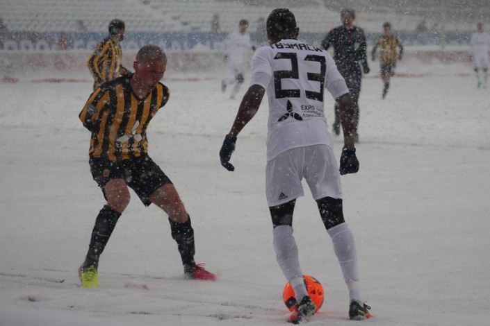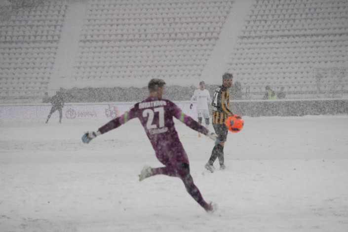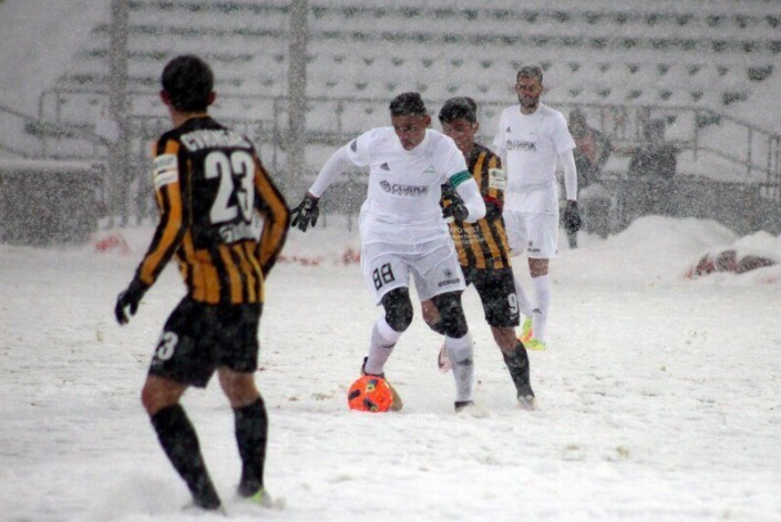 Встреча команд прошла 19 ноября в Алматы. Показать яркую и быструю игру футболистам помешала погода - всю встречу шел снег. Тем не менее еще в первом тайме команды нанесли по десять ударов по воротам соперника, хотя их точность оставляла желать лучшего. У "Астаны" лишь один удар пришелся в цель, тогда как у "Кайрата" - пять. При этом столичные футболисты больше владели мячом (51 против 49 процентов). Однако в первом тайме зрители забитых голов так и не увидели.