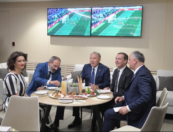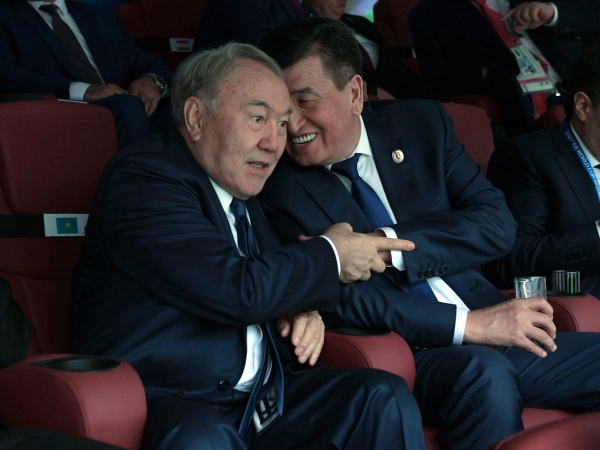 На снимке рядом с Назарбаевым сидят руководитель Администрации Президента Адильбек Джаксыбеков, президент Кыргызстана Сооронбай Жээнбеков и мэр Москвы Сергей Собянин.