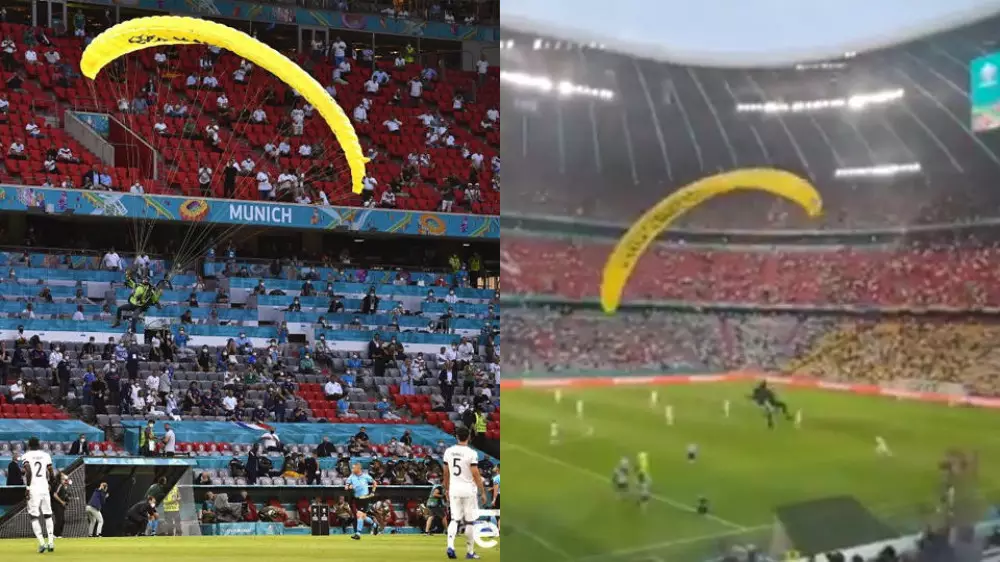 A Greenpeace activist lands at Arena Munich with a parachute prior to the UEFA EURO 2020 group F preliminary round soccer match between France and Germany in Munich 😂 pic.twitter.com/UBlvQgIvuo