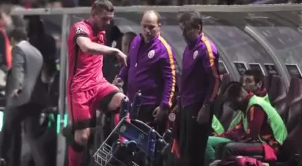 Форвард турецкого "Галатасарая" Лукас Подольски пнул ящик с водой после замены в матче второго тура группового этапа Лиги чемпионов с "Астаной", сообщают Vesti.kz.