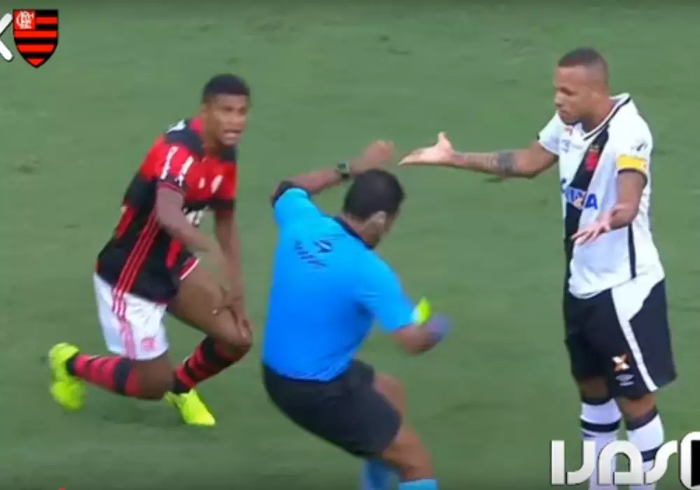 Арбитр Силва Сантос, обслуживающий матч чемпионата Бразилии между клубами "Фламенго" и "Васко да Гамо", симулировал нарушение правил против себя, после чего удалил форварда гостей. Фрагмент остался зафиксированным на видео и был опубликован на YouTube-канале Vasco HD, передает Lenta.ru