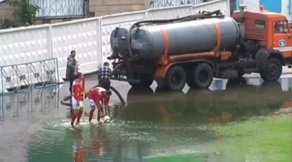Судя по комментариям пользователей, матч, больше похожий на водное поло, происходил в 2007 году на стадионе "Шахтер" в Экибастузе. Игра проходила между тогда еще клубами высшего дивизиона чемпионата Казахстана по футболу - "Экибастузом" и "Алма-Атой". А угловой разыгрывают Денис Родионов и Данияр Кенжеханов.
