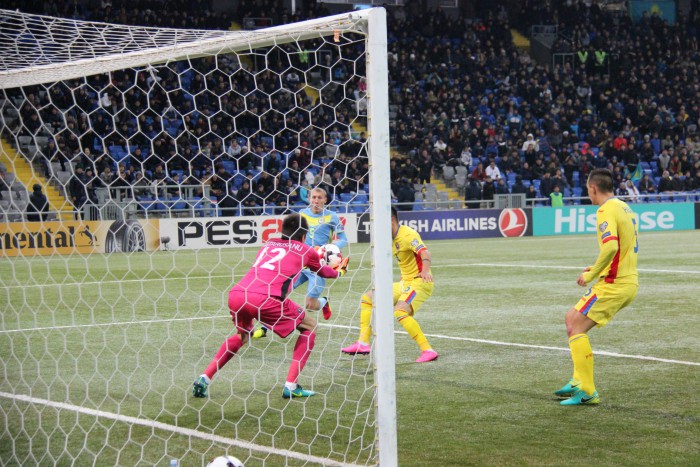Первый удар по воротам в этой игре нанес форвард румын Богдан Станку, пробивший на десятой минуте чуть выше цели. Ответ сборной Казахстана последовал на 21-й, однако Сергей Хижниченко не воспользовался моментом.