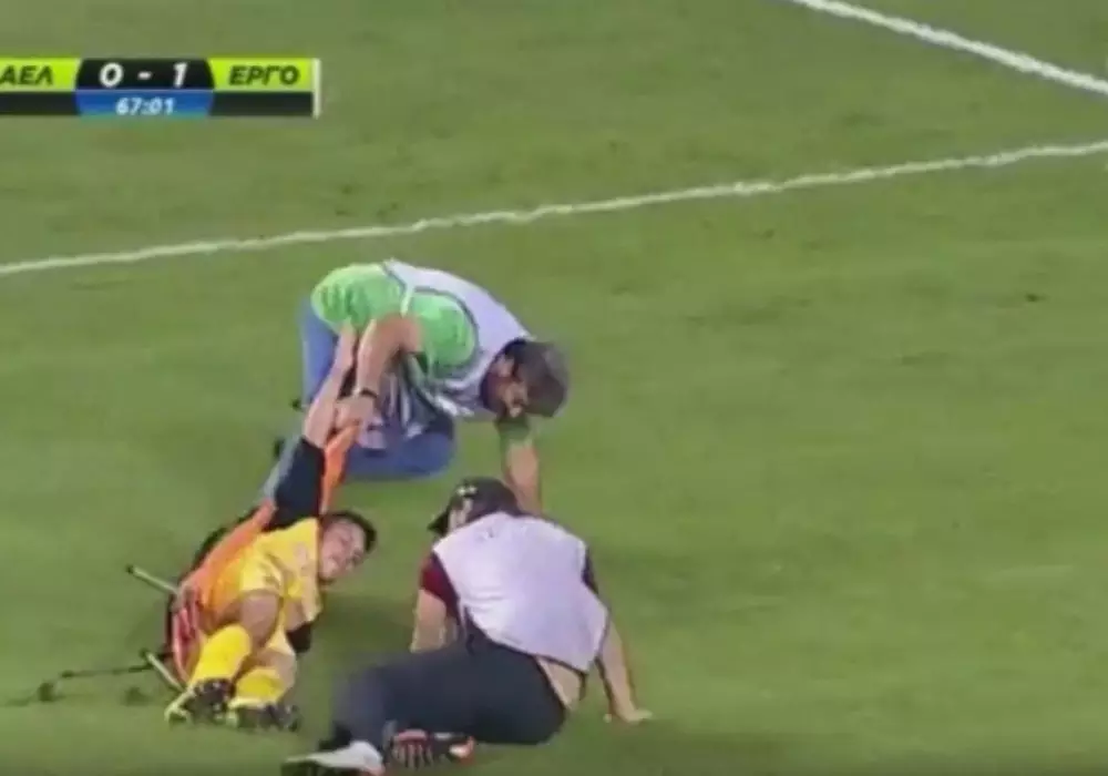 Полузащитник "Эрготелиса" Леонардо Коутрис получил травму и не смог подняться с поля. Однако, футболисты "Лариса" и сотрудники стадиона, судя по всему, предположили, что футболист нарочно затягивает время и симулирует.