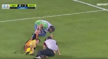 Полузащитник "Эрготелиса" Леонардо Коутрис получил травму и не смог подняться с поля. Однако, футболисты "Лариса" и сотрудники стадиона, судя по всему, предположили, что футболист нарочно затягивает время и симулирует.