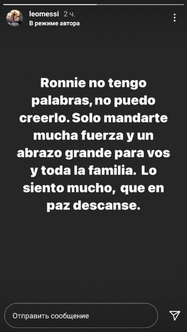 "Ронни, у меня нет слов. Я не могу в это поверить. Просто выражаю тебе поддержку, обнимаю тебя и всю твою семью. Я очень сожалею, мир ее праху", - написал Месси в "сториз" своего Instagram.