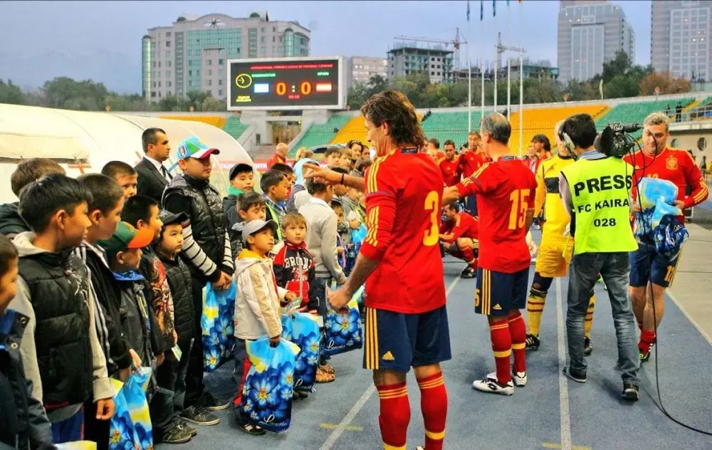 Как сообщает Федерация футбола Казахстана на своей странице в Twitter, ветераны сборной Испании приехали в Казахстан не с пустыми руками. Они привезли подарки для наших детей, больных гемофилией. "Этот жест доброй воли заслуживает уважения! Gracias!" - говорится в микроблоге.