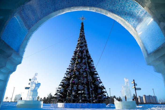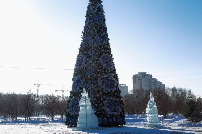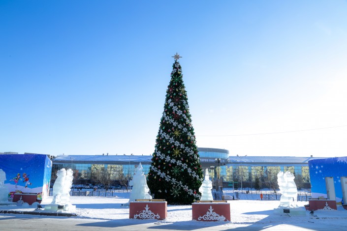 Еще один ледовый городок окружает елку у спортивного комплекса Алатау. Вокруг нее и животные, и снежные красавицы, и даже батыры изо льда.