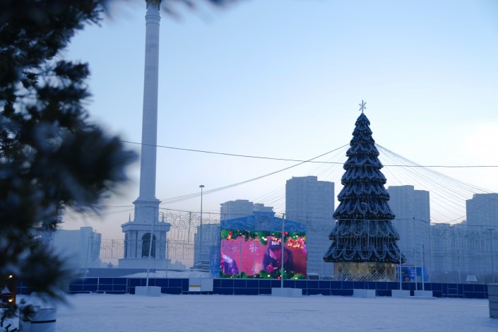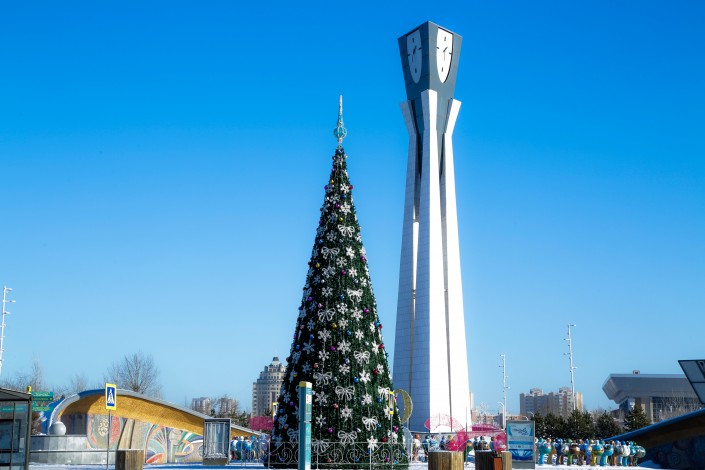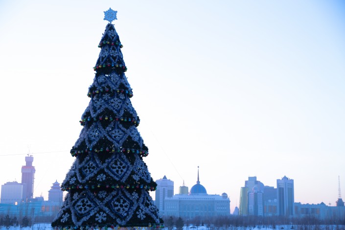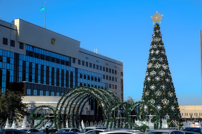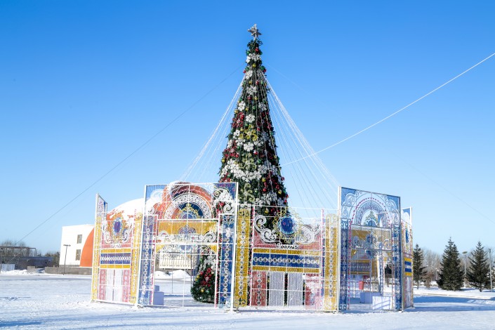 Городскую площадь украсила елка с казахскими орнаментами и красивейшими снежинками. А в изголовье елки - самая яркая и большая звезда.
