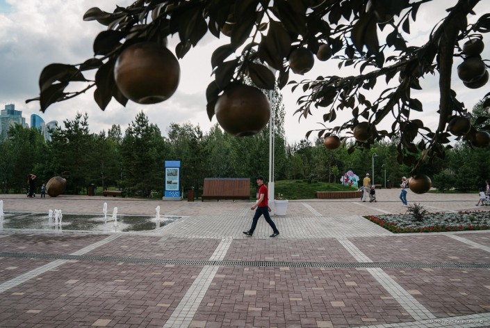 Здесь, с юга от центрального входа, в парк ведет главная аллея с фонтанами и площадью Апорта - символом Алматинской области, холмами, имитирующими горы, и беседками.