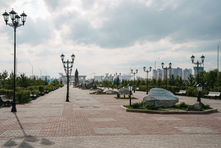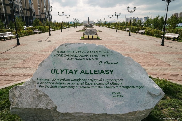 Аллея стала подарком от Карагандинской области. Цитата Президента об Улытау высечена на камне Жадеит.