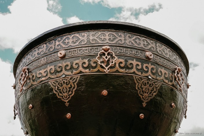 В центре композиции расположена чаша "Тайказан", изготовленная в Шымкенте, которая представляет собой художественное решение ручной работы из меди с декоративными элементами и снабжена туманообразователем. Вода распыляется над поверхностью, создавая видимость чаши с кипящей водой. Высота чаши - 6,5 метра, диаметр - 7,9 метра.