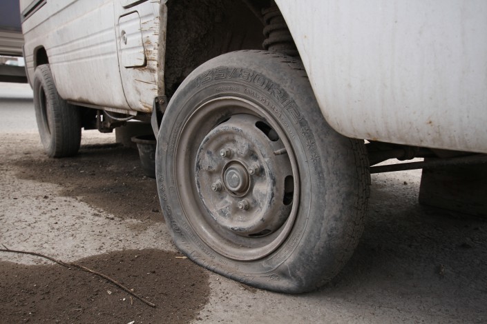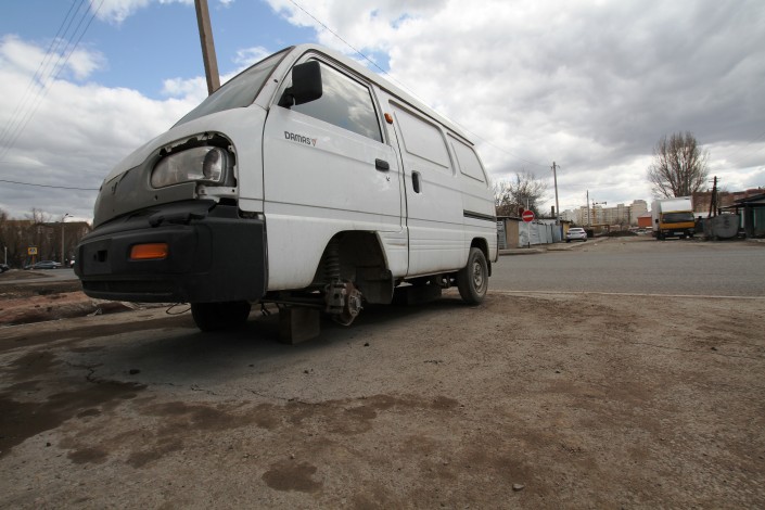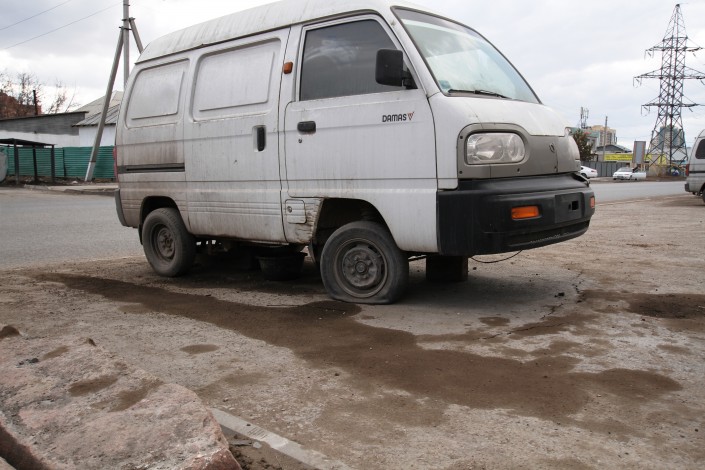 Левого переднего колеса у этого автомобиля нет, переднее правое - спущено.