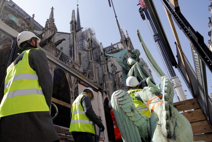 Главным объектом реставрации был шпиль, который полностью сгорел. 11 апреля рабочие сняли статую Святого Иоанна с его основания.