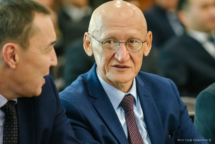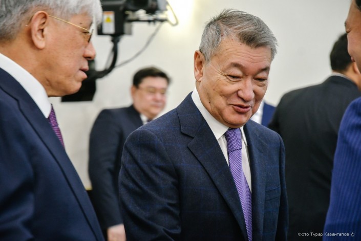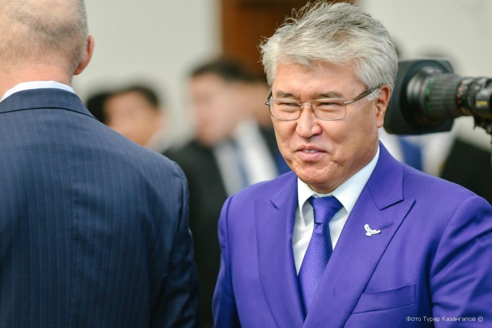 Как и у других приглашенных, на лацкане пиджака у него есть значок. Только написано там не "Рухани жаңғыру", а "Астана Моторс".