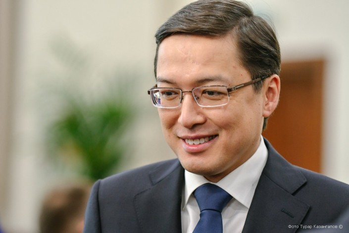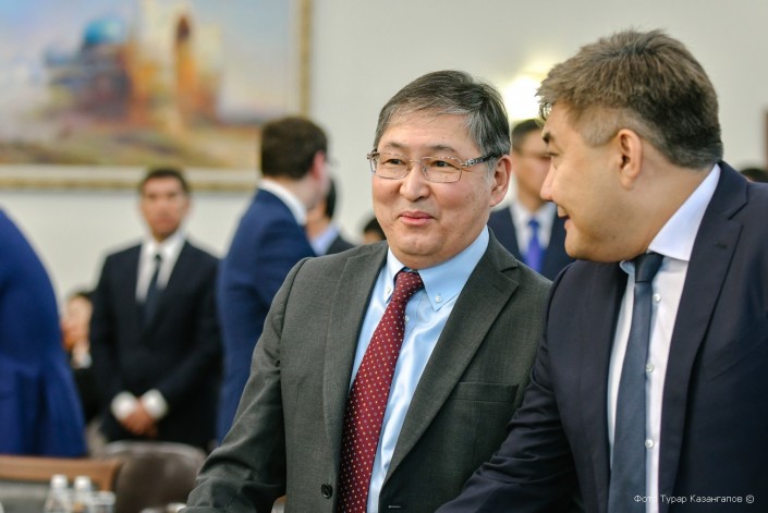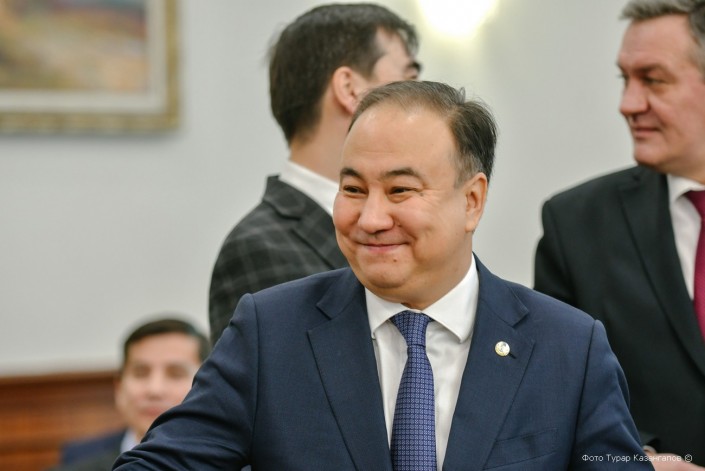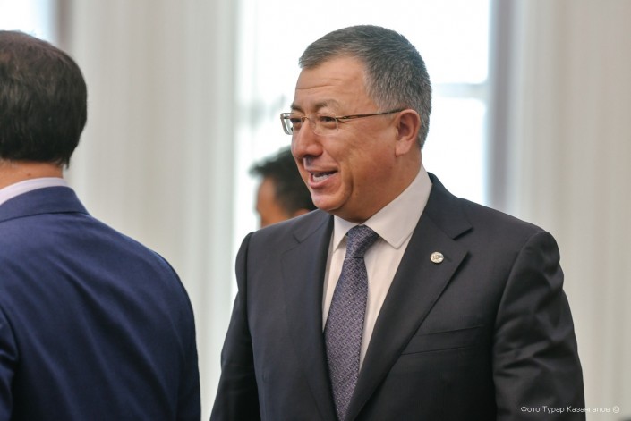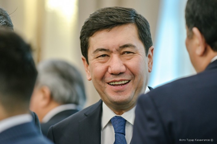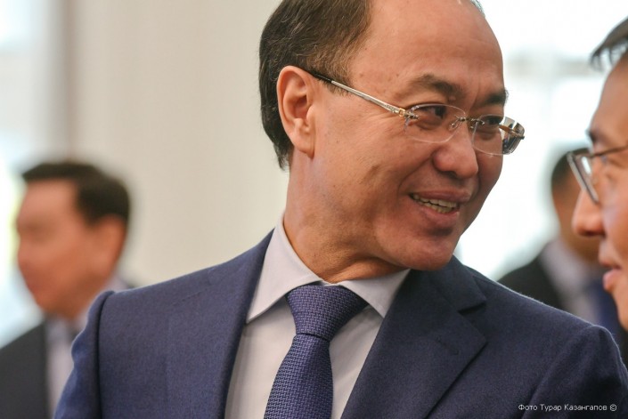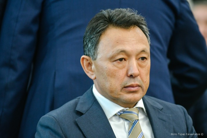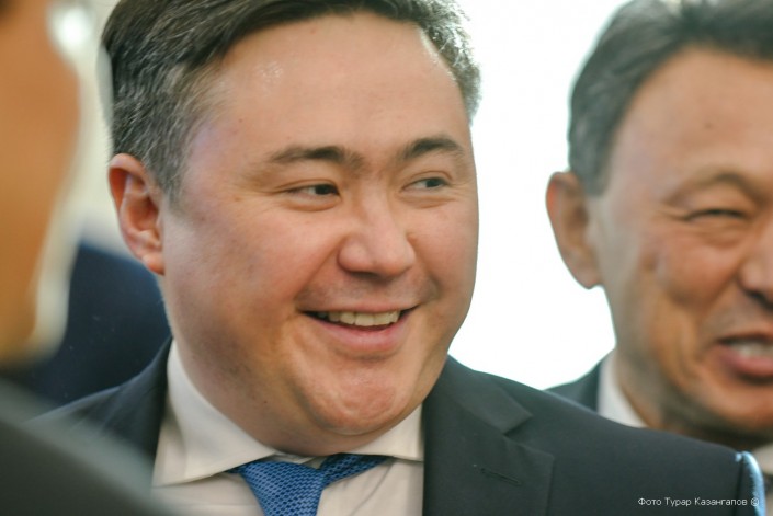 Министр культуры и спорта Арыстанбек Мухамедиулы. На лацкане пиджака у него значок "Рухани жаңғыру".