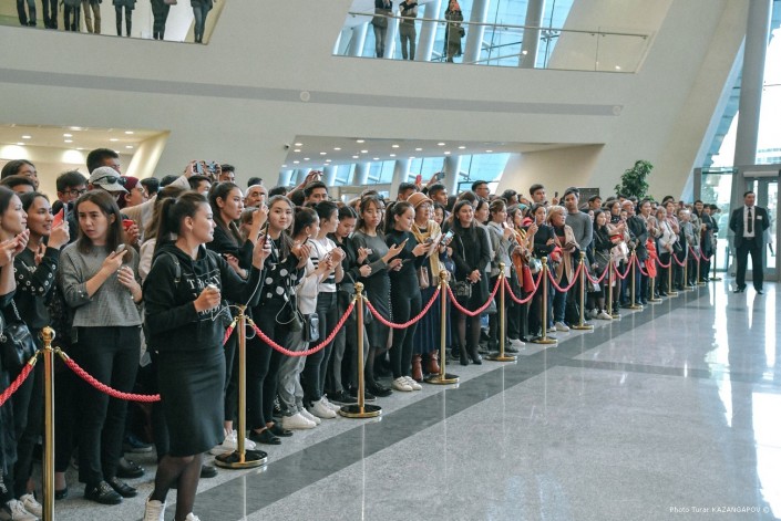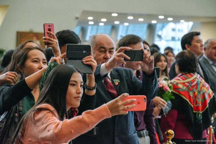 Публика тепло встретила главную героиню картины. Было много цветов и желающих сделать селфи с "царицей Томирис". Но большая часть зрителей снимали ее со стороны на камеры смартфонов. В их числе мы заметили мажилисмена Владислава Косарева, который тоже пришел на премьеру.