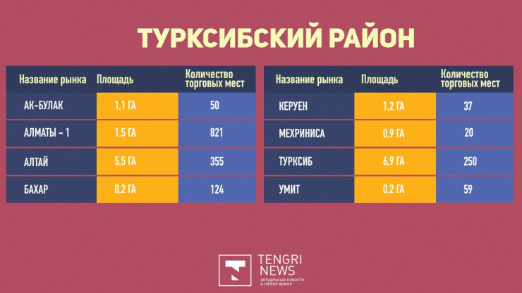В Турксибском районе расположено 8 рынков, в Алмалинском - 6, Ауэзовском - 4, Наурызбайском - 3, Бостандыкском и Медеуском районах- по 2 рынка.