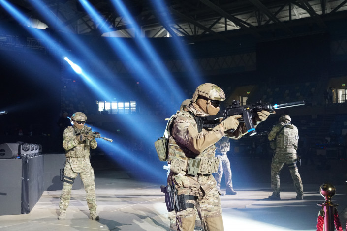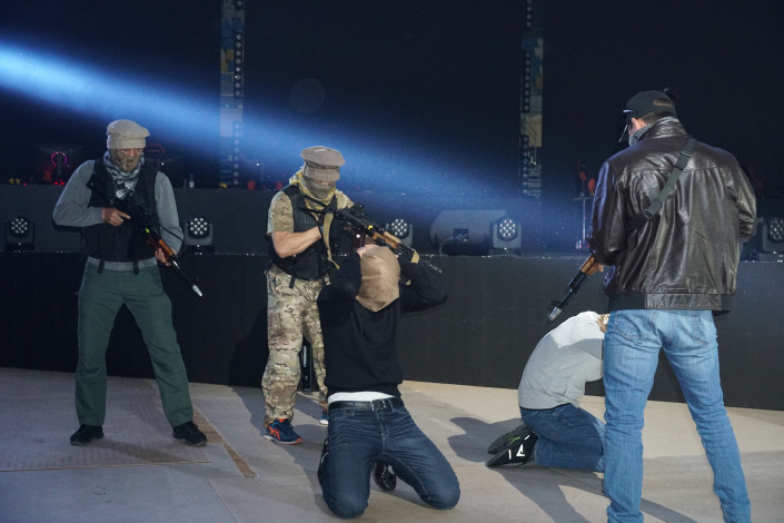 Который продолжился их "спасением". Причем спецназ спустился буквально с потолка Дворца единоборств Jekpe Jek: так свое мастерство показали реальные бойцы службы "А" КНБ.