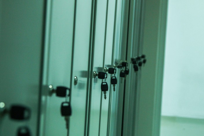 Проходим через санпропускник, он содержит две раздевалки - у каждого сотрудника есть свой шкафчик в обеих раздевалках. В первой оставляют уличную одежду, во второй надевают халаты, бахилы, шапочки.