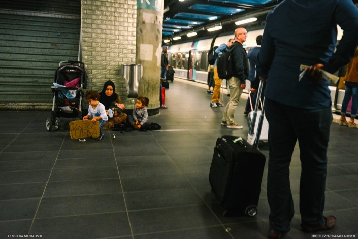 Помимо уличных музыкантов, в переходах парижского метро можно встретить и мигрантов. Судя по табличке, эта семья приехала из Сирии.