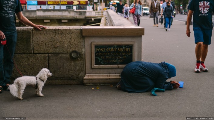 Этот снимок можно было бы назвать "Блеск и нищета Парижа". Женщина, сложив ладони как будто в молитве, покорно встречает людей, возвращающихся со стороны Собора Парижской Богоматери.