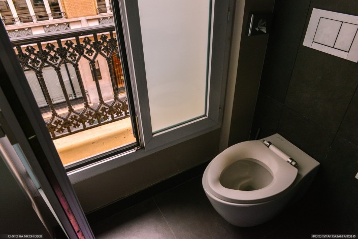 Кстати, малогабаритность распространяется не только на квартиры, но и на отели. Вот так в трехзвездочной гостинице в центре Парижа выглядит ванная комната. Унитаз, по всей видимости в целях экономии, поставлен впритык к окну.