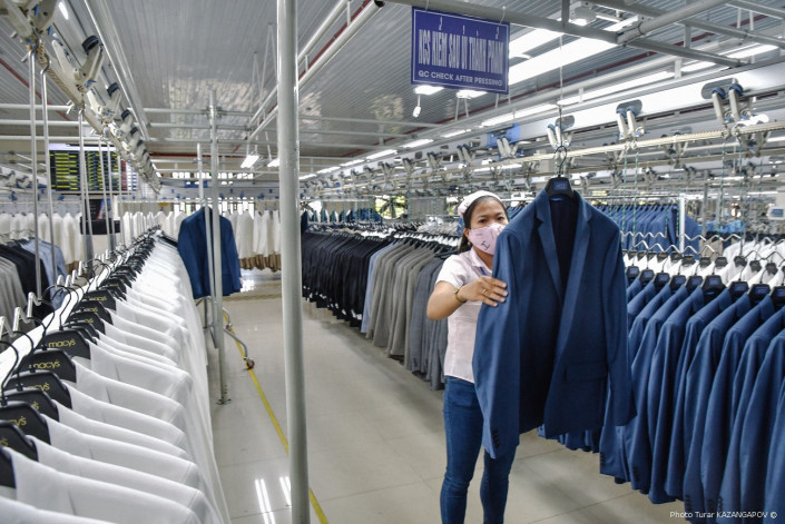 Работают вьетнамцы дружно: один строчит на машинке, другой утюжит.