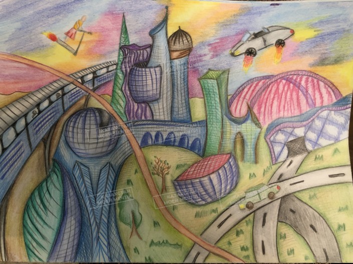 Следующая участница конкурса - Галия также изобразила будущее столицы. Однако к летающему транспорту она добавила самокат на реактивной тяге.