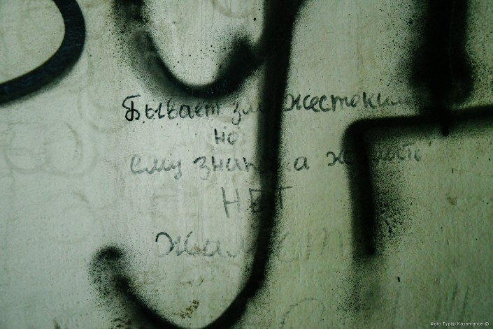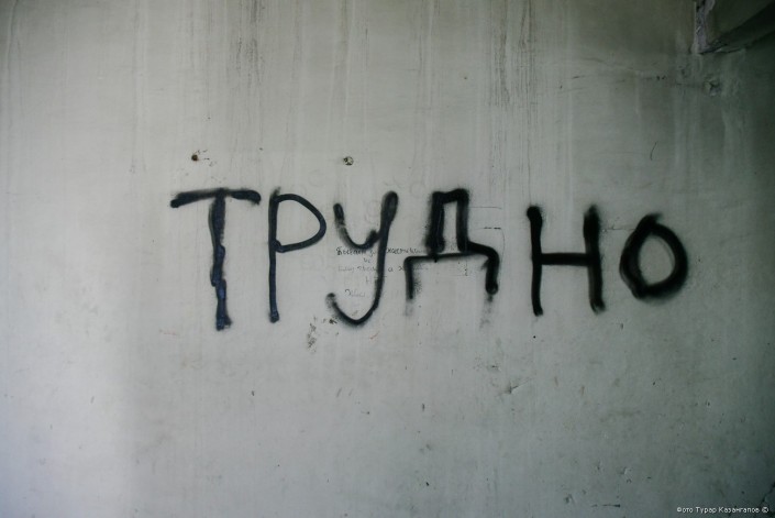 Надписи на стенах красноречиво говорят о ситуации в поселке. "Трудно".