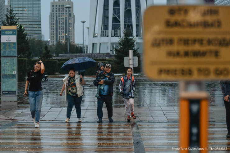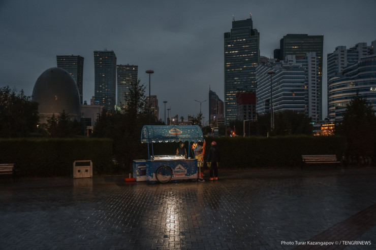 Дождь превратил тротуары и дороги в отражающие поверхности. Местами даже может показаться, будто ты уже не в Нур-Султане, а, например, в Сеуле или Нью-Йорке.