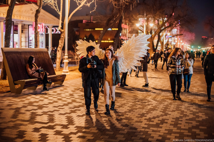 В этот момент где-то рядом слышим: "Не желаете фото на память?" Девушку в костюме ангела зовут Аружан, говорит, что сегодня они с другом решили прогуляться, а заодно пофотографировать людей. Несмотря на то, что пока они студенты, у них уже есть своя фотостудия и большое желание работать. А за работу берут от 500 до 800 тенге.
